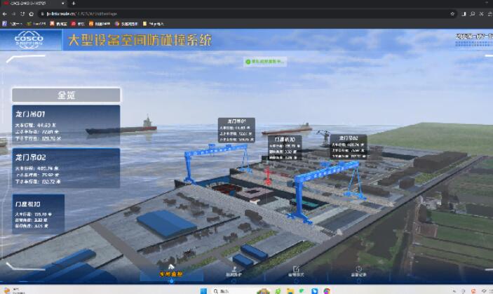 需要做集中集控管理的用戶,系統(tǒng)還需配置遠(yuǎn)程三維監(jiān)控平臺(tái)。將船塢組裝場地進(jìn)行三維場景模型處理,且需保證關(guān)鍵位置(如軌道位置關(guān)系等設(shè)備運(yùn)行活動(dòng)范圍)與設(shè)備產(chǎn)生空間關(guān)系的區(qū)域,按照1:1精確建模,并展示上做突出處理,保證能準(zhǔn)確、清晰地反映設(shè)備當(dāng)前工況。