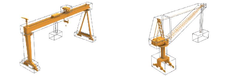 將關(guān)聯(lián)的吊機(jī)設(shè)備按實(shí)體結(jié)構(gòu)實(shí)際尺寸,分解成N個(gè)6面體數(shù)據(jù)模型,數(shù)據(jù)模型的基礎(chǔ)尺寸按吊機(jī)的實(shí)際幾何尺寸1:1比例設(shè)立,其真實(shí)地反映了吊機(jī)設(shè)備實(shí)體的裝配位置關(guān)系、外形尺寸。