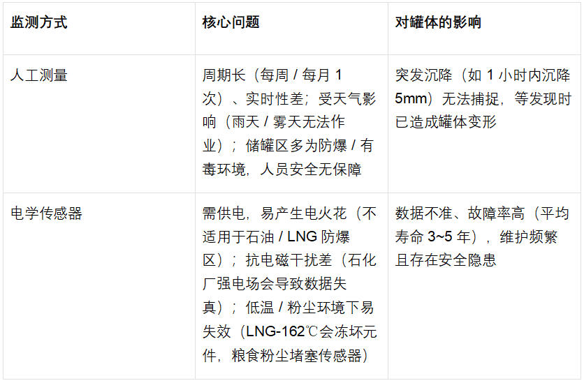 目前行業(yè)常用的 “人工測(cè)量(水準(zhǔn)儀 / 全站儀)”“電學(xué)傳感器(應(yīng)變片)” 完全無法適配罐體需求,具體問題如下: