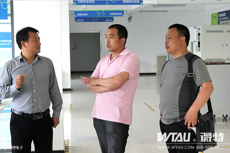 微特電子總經(jīng)理聶道靜對兩位遠(yuǎn)道而來的貴客表示歡迎,微特水電事業(yè)部經(jīng)理韓信與技術(shù)工程師劉普文向郭永崗、田國強(qiáng)詳細(xì)介紹了微特電子的發(fā)展歷程及產(chǎn)品技術(shù)。同時還一同來到微特建設(shè)的智能吊裝設(shè)備研發(fā)檢測中心,參觀高溫老化實驗機(jī)、雷擊浪涌、靜電測試、振動實驗等實驗檢測設(shè)備。這些實驗設(shè)備是微特電子高品質(zhì)產(chǎn)品的保證,確保每一臺出廠的設(shè)備都是百分百合格。
