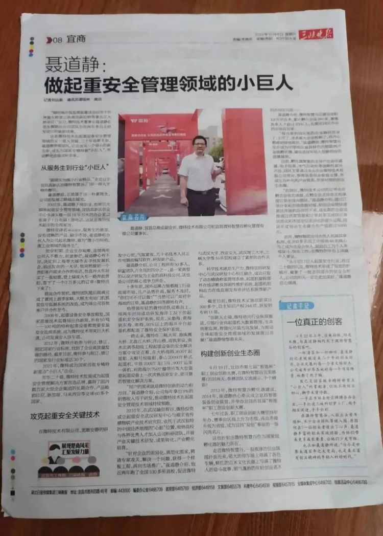 10月8日,湖北日?qǐng)?bào)刊發(fā)《聶道靜:做起重安全管理領(lǐng)域的小巨人》的長篇文章。