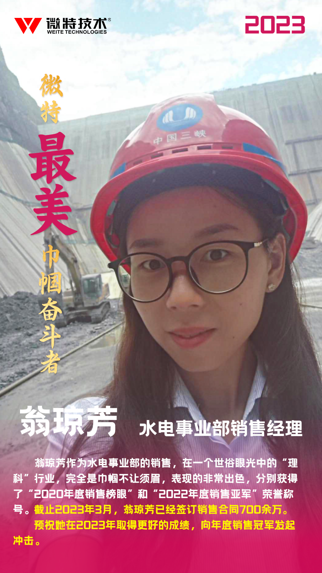 我想起微特公司 “一直致力于為客戶提供有價(jià)值的產(chǎn)品和服務(wù),為客戶提供更加安全可靠的解決方案”的理念與宗旨,原來已經(jīng)潤(rùn)物細(xì)無聲的浸透到每一位微特人的骨子里。而翁瓊芳作為水電事業(yè)部的銷售,在一個(gè)世俗眼光中的“理科”行業(yè),完全是巾幗不讓須眉,表現(xiàn)的非常出色,分別獲得了“2020年度銷售榜眼”和“2022年度銷售亞軍”榮譽(yù)稱號(hào)。截止2023年3月,翁瓊芳已經(jīng)簽訂銷售合同700余萬,我也預(yù)祝她在2023年取得更好的成績(jī),向年度銷售冠軍發(fā)起沖擊。